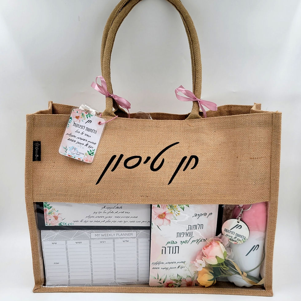 תיק יוטה עם הדפסת שם חצי שקוף/ ללא שקוף